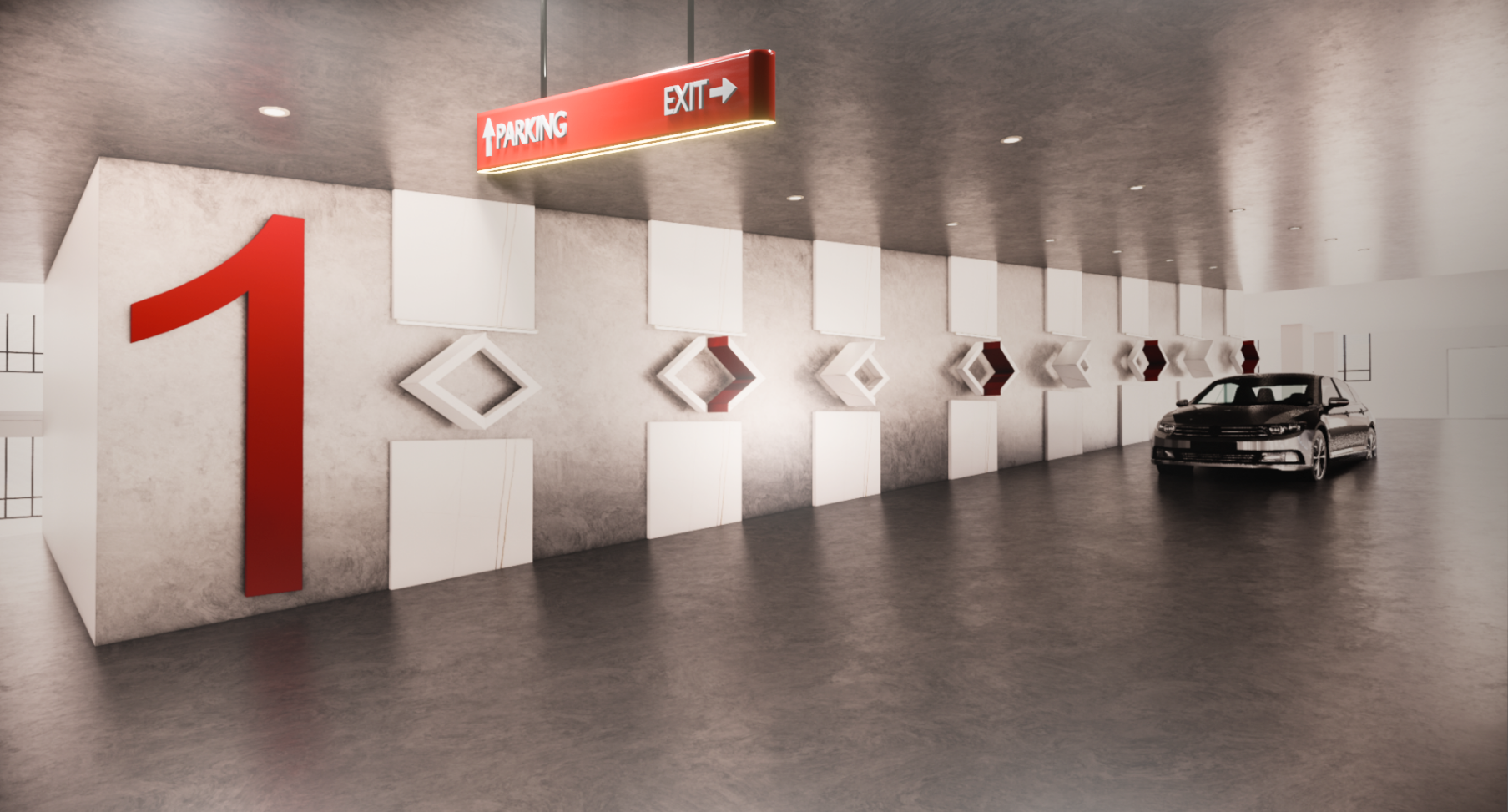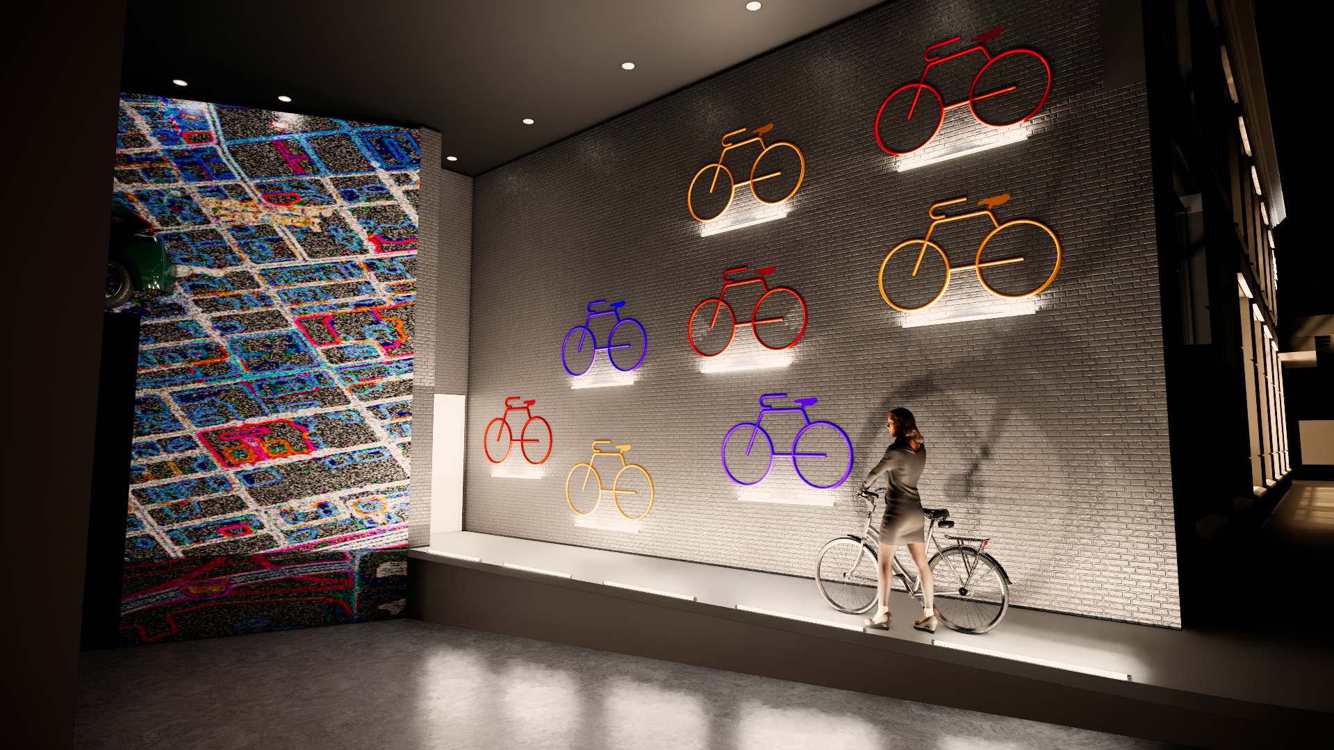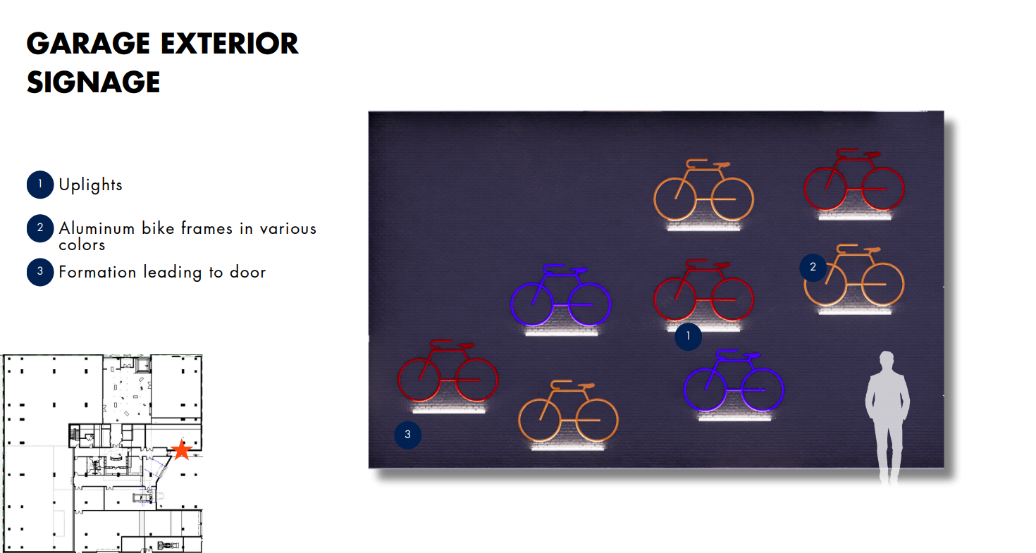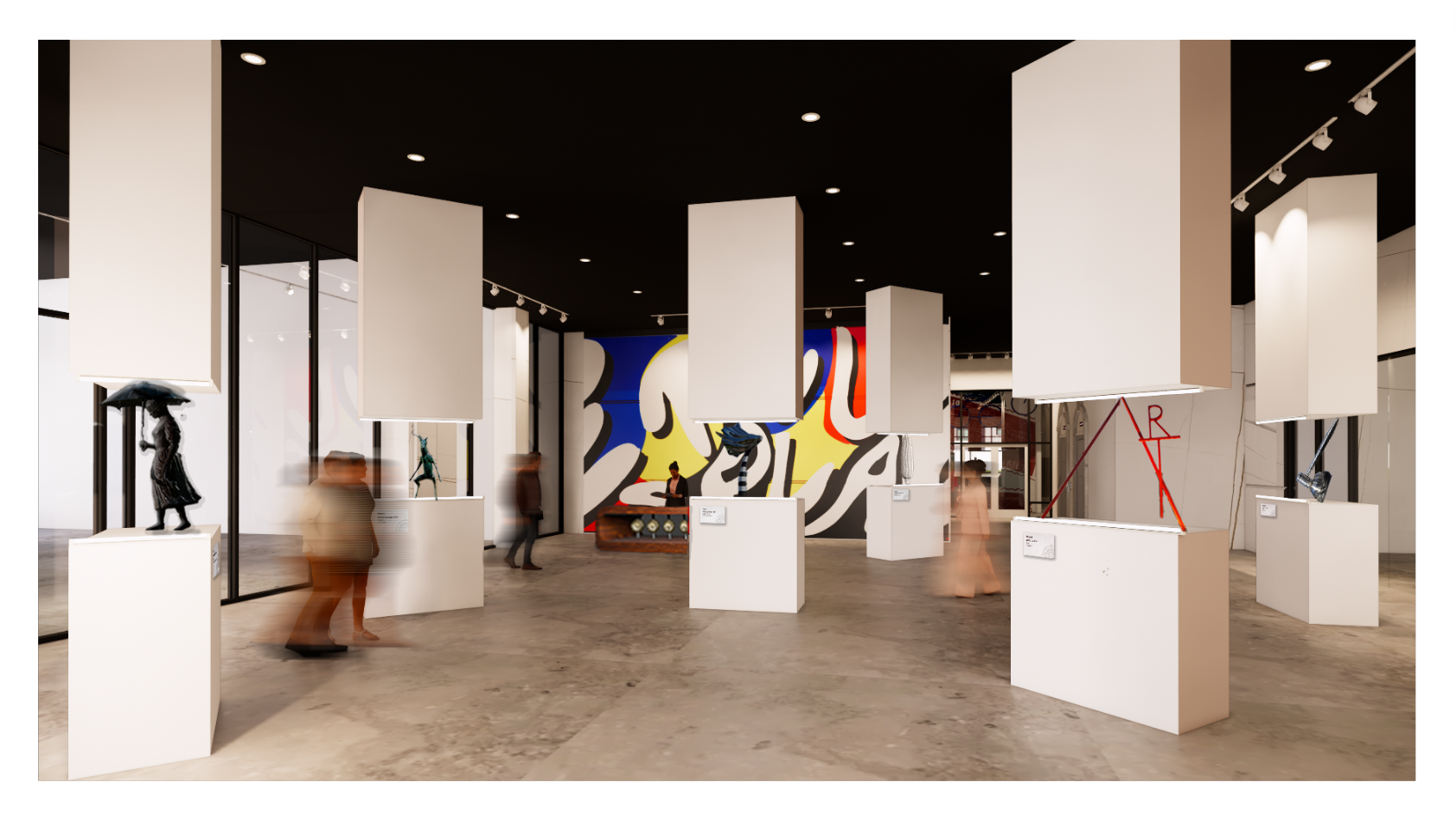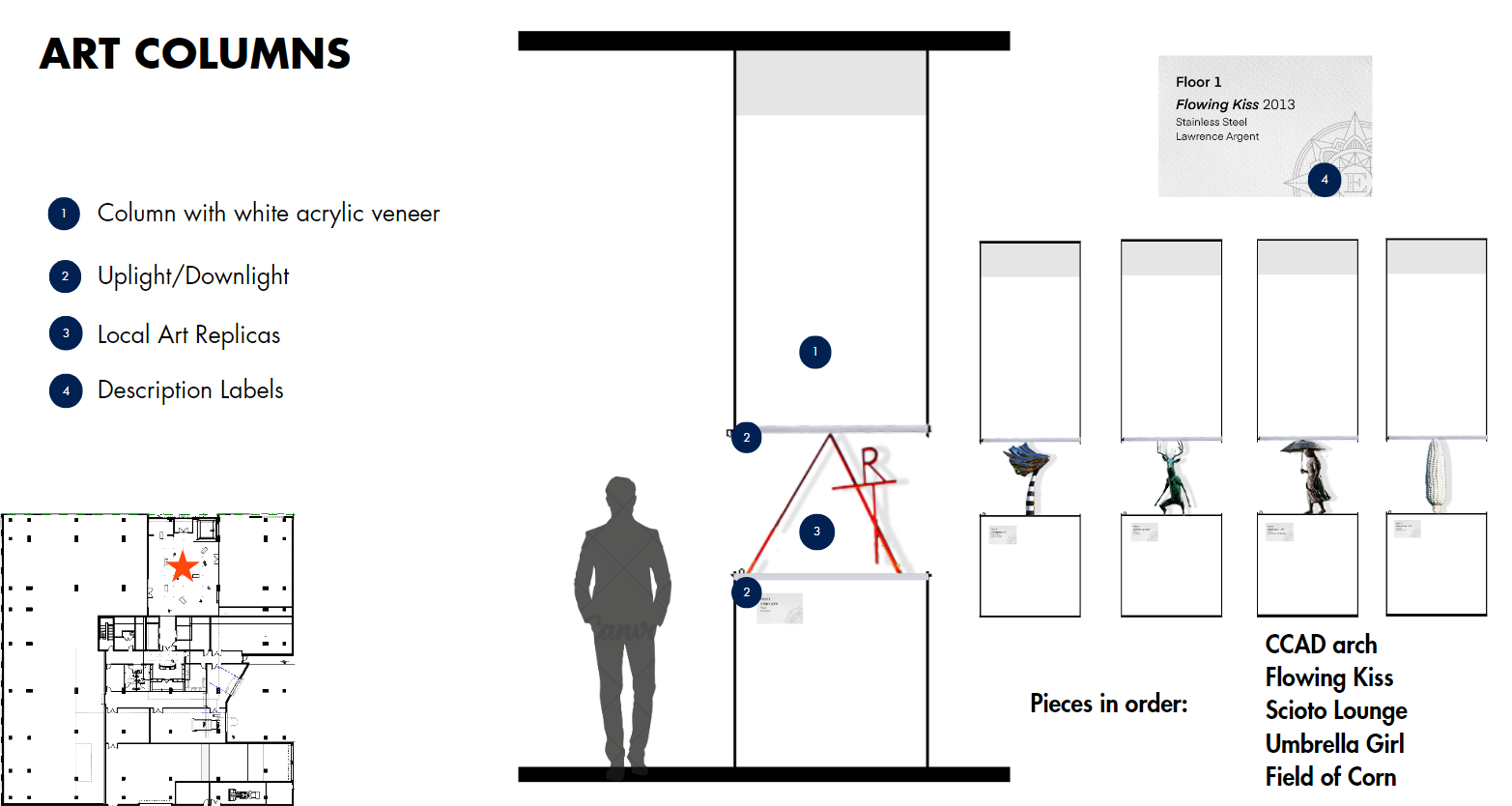 This gallery area was created to transform the lobby into an immersive experience for the users. Additional columns were added to the existing to showcase art pieces from around Columbus.