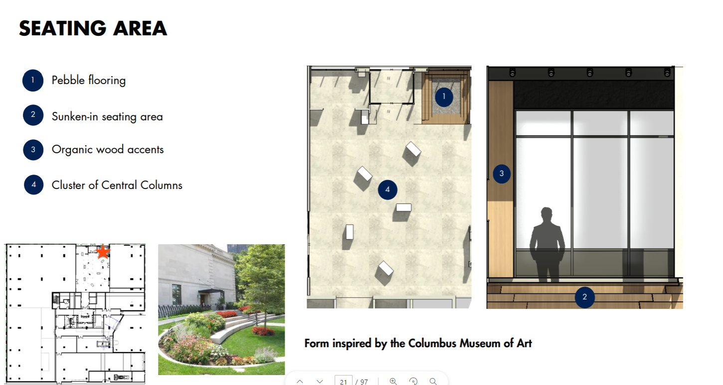 A sculpture garden inspired by the Columbus Museum of Art. The Zen Garden seating area ties back to the seating area in the lobby, creating vertical cohesion.